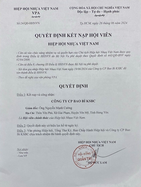 Ngày 26 tháng 4 năm 2024, tại thành phố Hồ Chính Minh, VPA đã có công bố quyết định Công ty Cổ phần Bao bì KSBC trở thành thành viên chính thức của Hiệp hội Nhựa Việt Nam. Đây là một bước tiến mới đánh dấu sự nỗ lực trong quá trình xây dựng và phát triển của Công ty Cổ phần Bao bì KSBC.