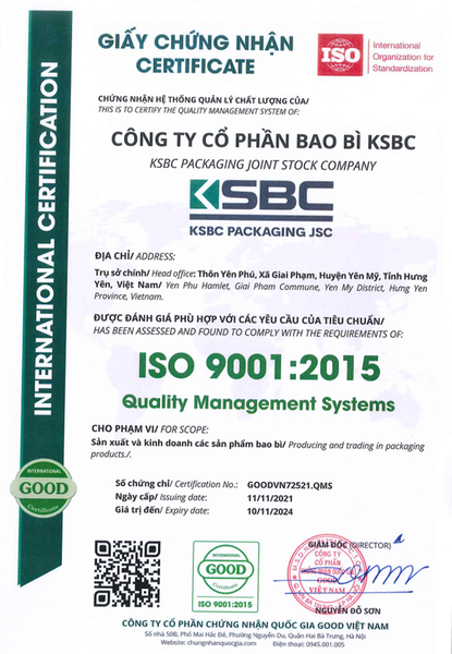 Ngày 11/11/2021, KSBC được cấp giấy chứng nhận có hệ thống quản lý chất lượng phù hợp với tiêu chuẩn ISO 9001:2015. Việc áp dụng hệ thống quản lý chất lượng ISO 9001: 2015 giúp cho sản phẩm bao bì nhựa của KSBC luôn đảm bảo chất lượng, mẫu mã, màu sắc, chủng loại đa dạng, mang đến sự hài lòng cho khách hàng.